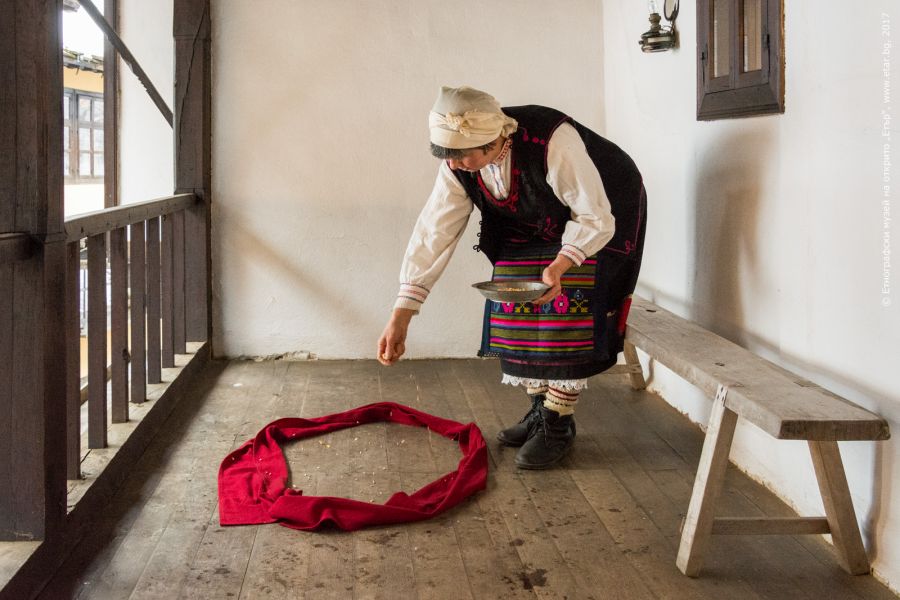 В Самарджийската къща на музея на открито Милка Кръстева отрано бе приготвила трапеза, за да посреща гости на Игнажден. Бабата направи кръг от пояс на чардака в Самарджийската къща, в който няколко пъти посипа зърна: