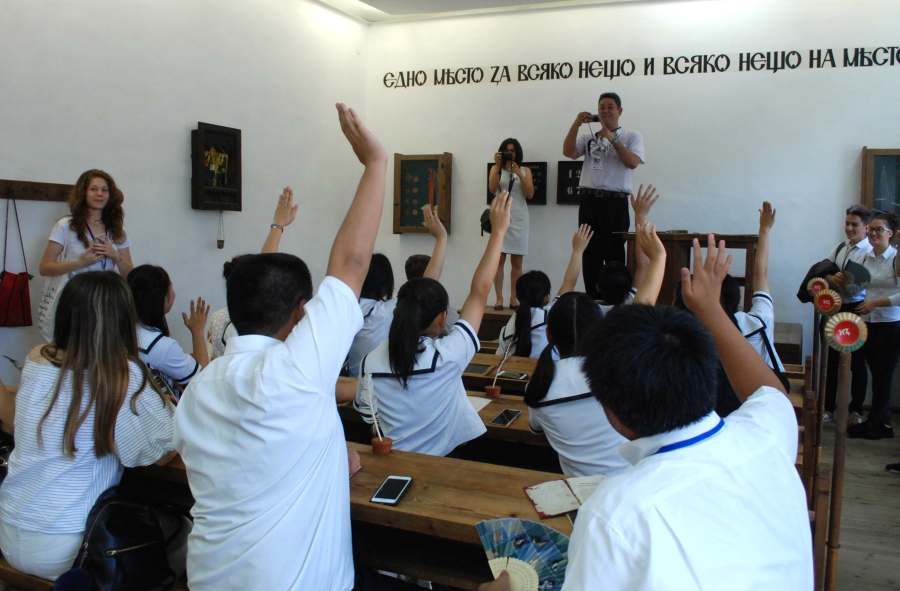 Днес сутринта гимназистите от Япония се пренесоха в автентичната атмосфера на килийното и взаимоучително училище, в класната стая от началото на миналия век. Писаха йероглифи в „пясъчника“, държаха перодръжки и с интерес разглеждаха училищните уреди и апарати, тетрадките и чантите на своите връстници.
