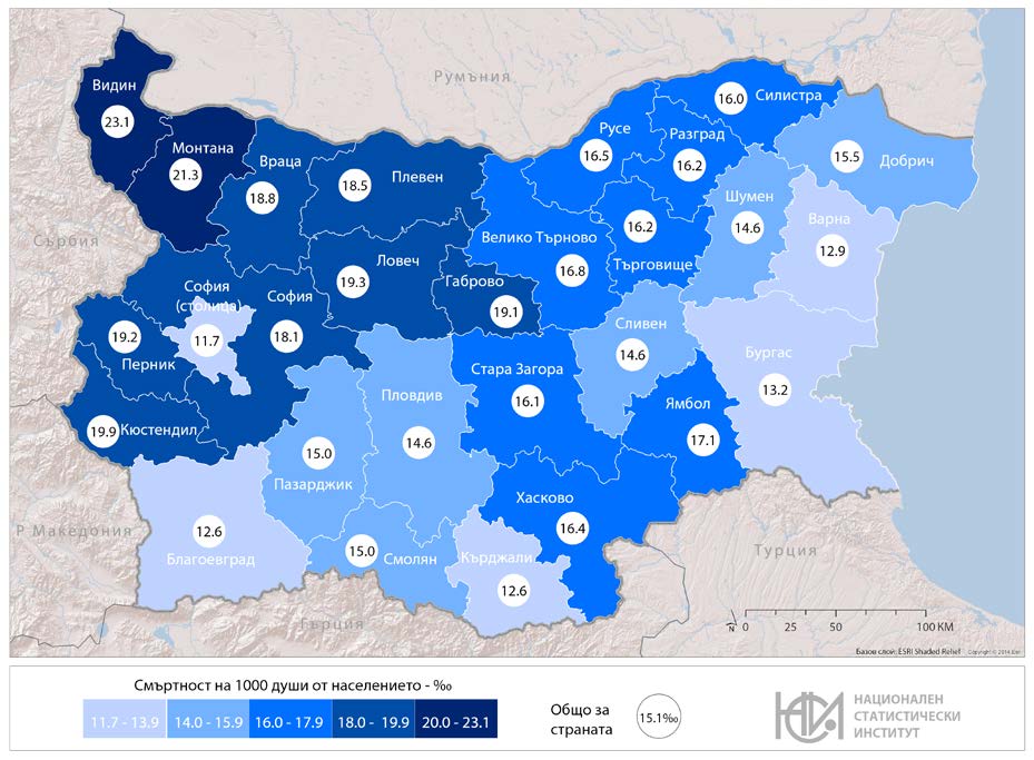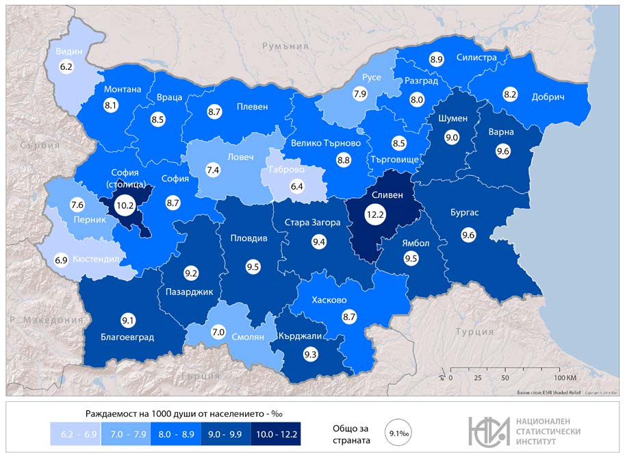 В осемнадесет области раждаемостта е по-ниска от средната за страната, като най-ниски стойности се наблюдават в областите Габрово (6.4‰) и Видин (6.2‰).