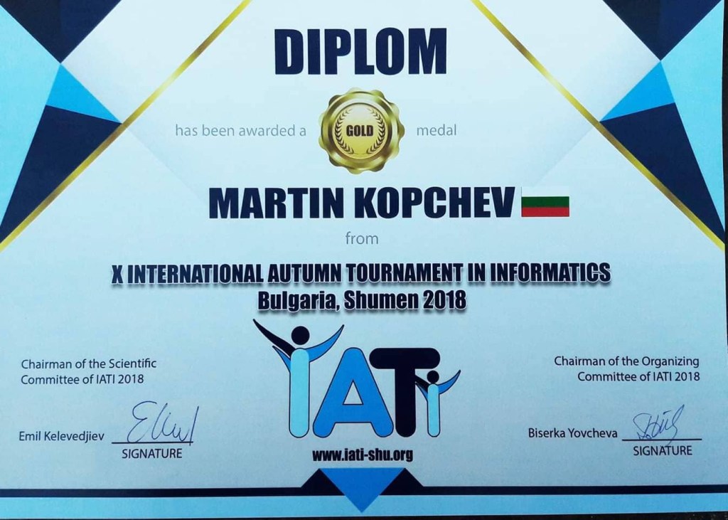 Първият златен медал за Мартин е от X Международен есенен турнир по информатика, който се проведе на 21-25 ноември 2018 в Шумен.